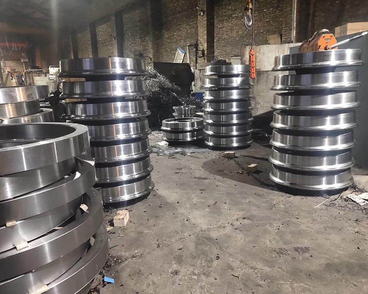 大型法蘭是先把中板割成合適的條子,條子的長短根據(jù)大型法蘭的規(guī)格而定。然后用卷環(huán)機(jī)卷制成圓圈,用焊條把接口處焊接牢固,焊口處要進(jìn)行X光譜檢驗(yàn)。再用壓力機(jī)將其壓平,再用車床進(jìn)行加工水線、倒角等工藝,用分度盤配合鉆孔機(jī)進(jìn)行螺栓孔的打孔的加工。在打螺栓孔的時(shí)候是不可以把螺栓孔打在有大型法蘭焊口的地方的。